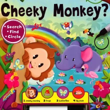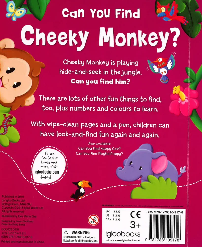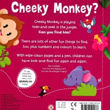 Cheeky Monkey is playinghide-and-seek in the jungle.Can you find him There are lots of other fun things to find, too, plus numbers and colours to learn. With wipe-clean pages and a pen, children can have look-and-find fun againand again.