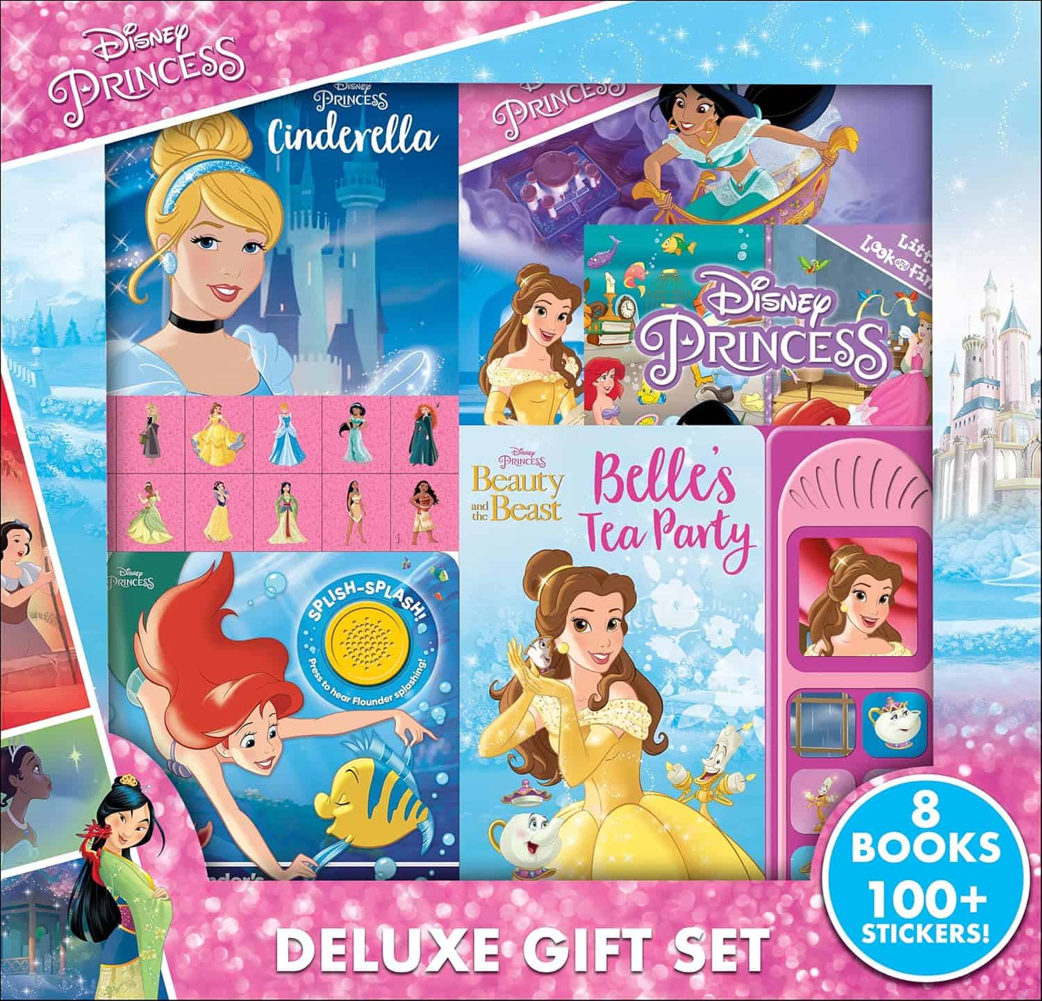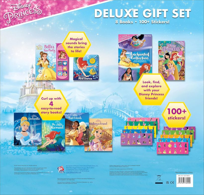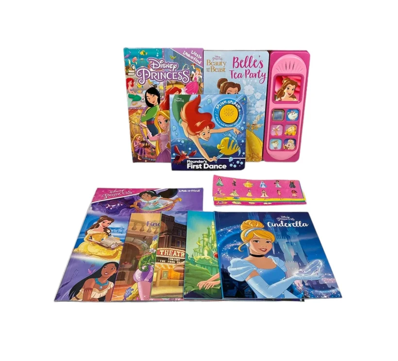 Look, find, listen, and explore! Join Belle, Ariel, Cinderella, Jasmine, and more Disney Princess friends on their adventures with this deluxe gift set that includes 8 great books and more than 100 stickers! Search busy Look and Find scenes, press sound buttons to bring princess stories to life, and curl up with softcover storybooks for hours of interactive fun.