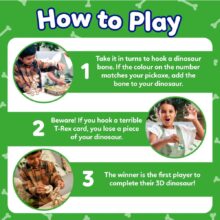 Race to find all the bones to build your 3D dinosaur! Each player selects a pick colour, which correlates to the colour of their dinosaur. Players take it in turns to hook a dinosaur bone from the 3D board. If the colour on the number matches their pick colour, they can add the piece to their dinosaur body! BUT beware, if you hook a T-Rex card, you’ll lose a piece of your dinosaur back to the board! Players will have lots of fun developing matching and memory skills and encouraging development of dexterity in this exciting 3D prehistoric game!
