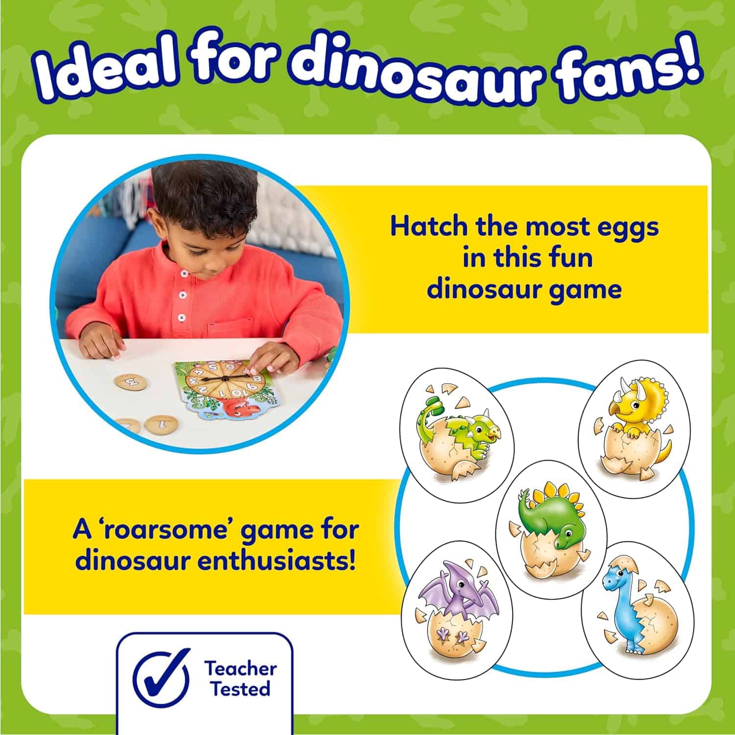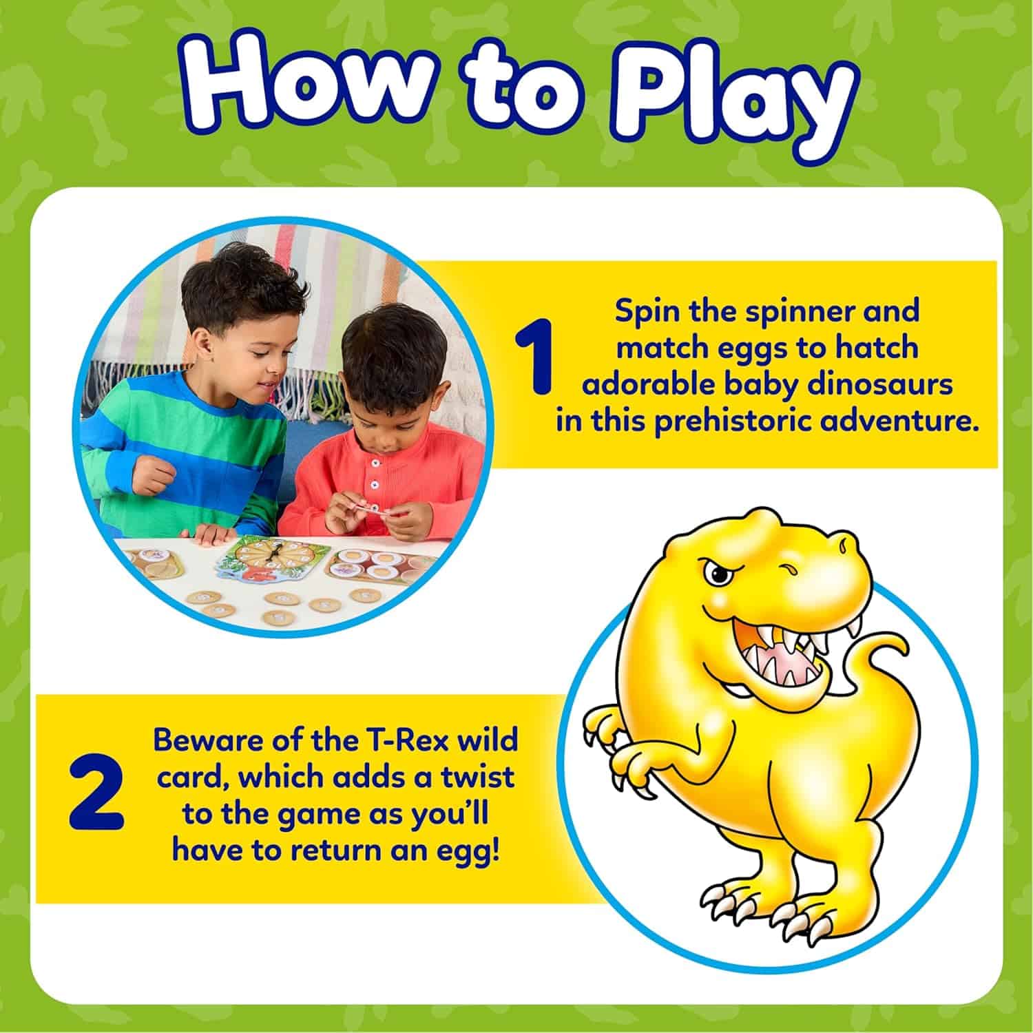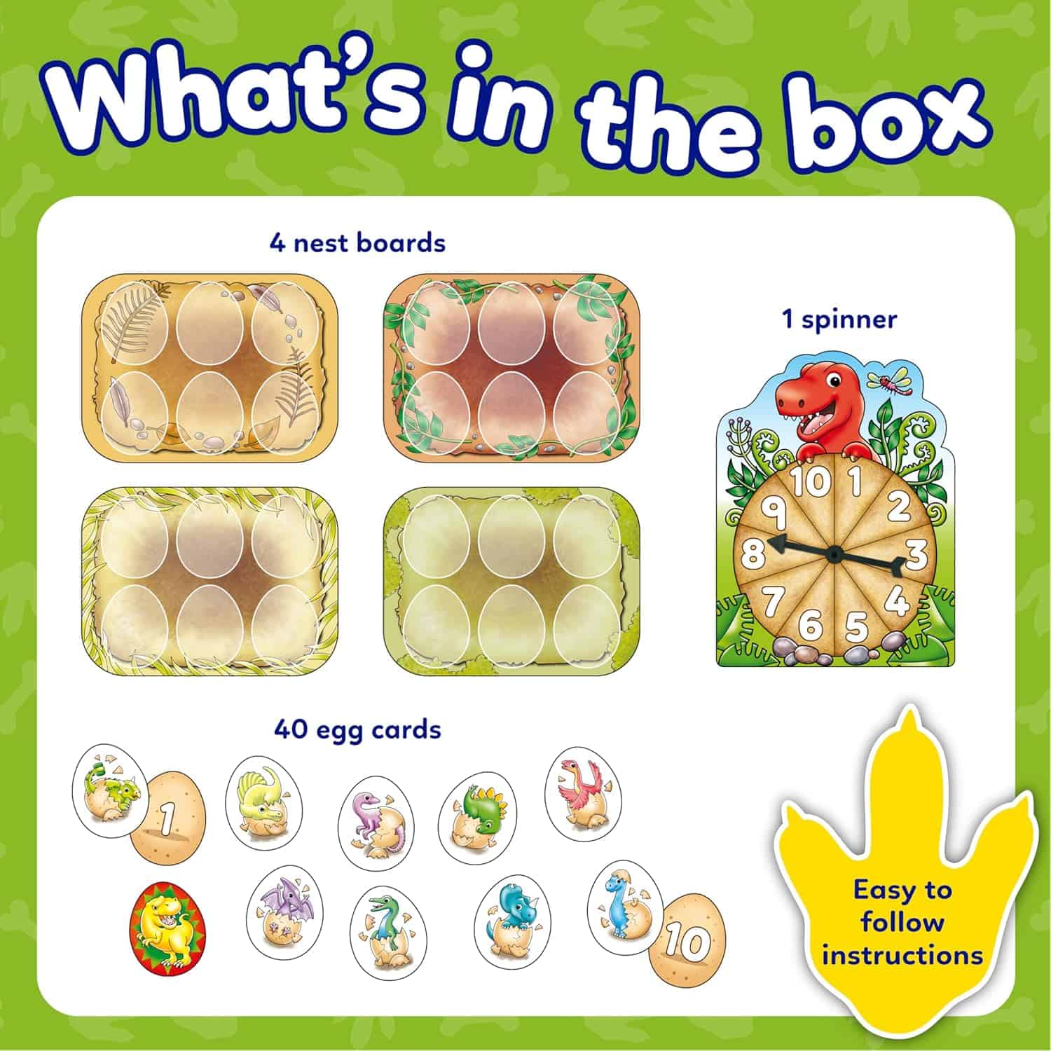 • FUN AND SIMPLE GAMEPLAY: Players spin the spinner and match the number to eggs, as they race to hatch the most baby Dinosaurs in this fun number game.