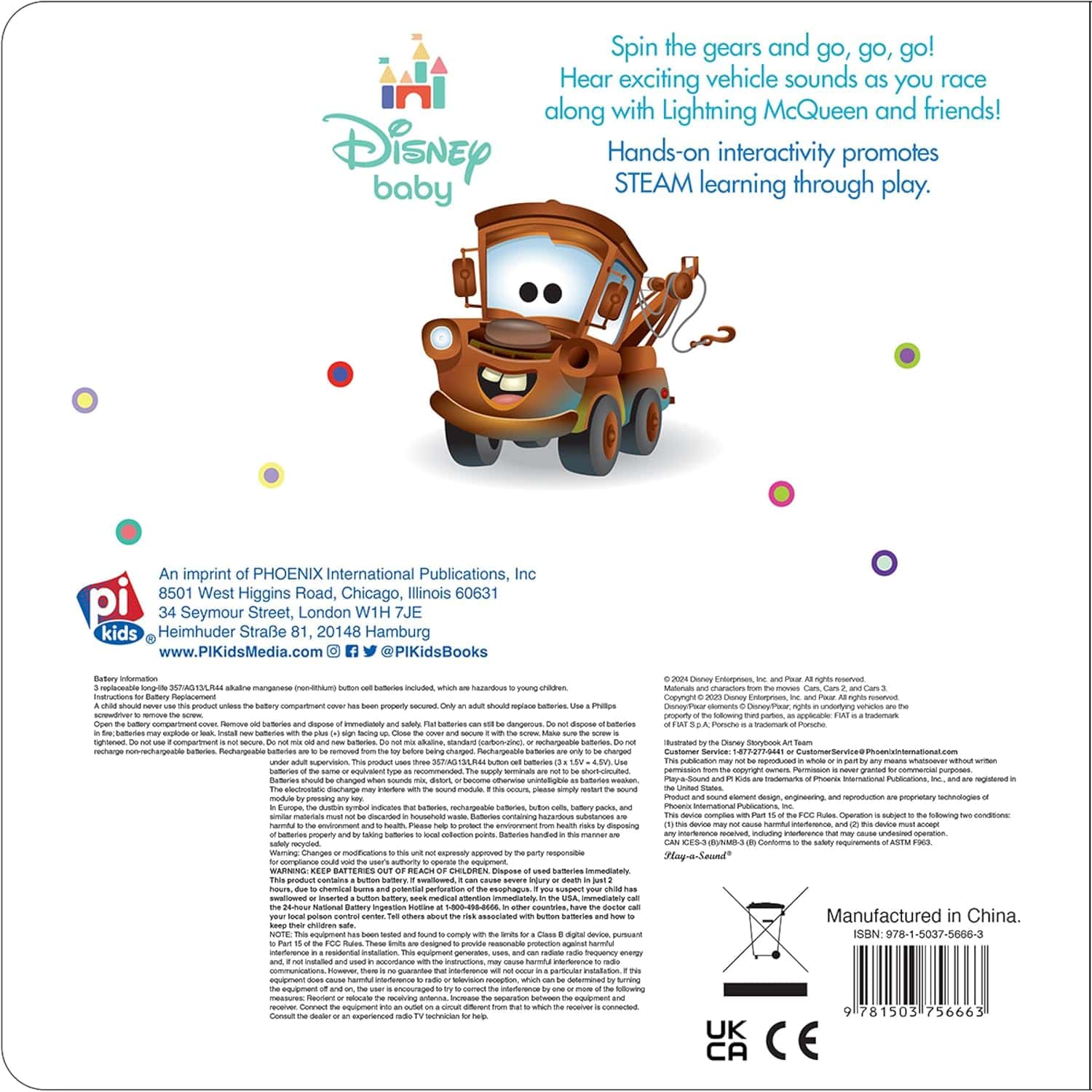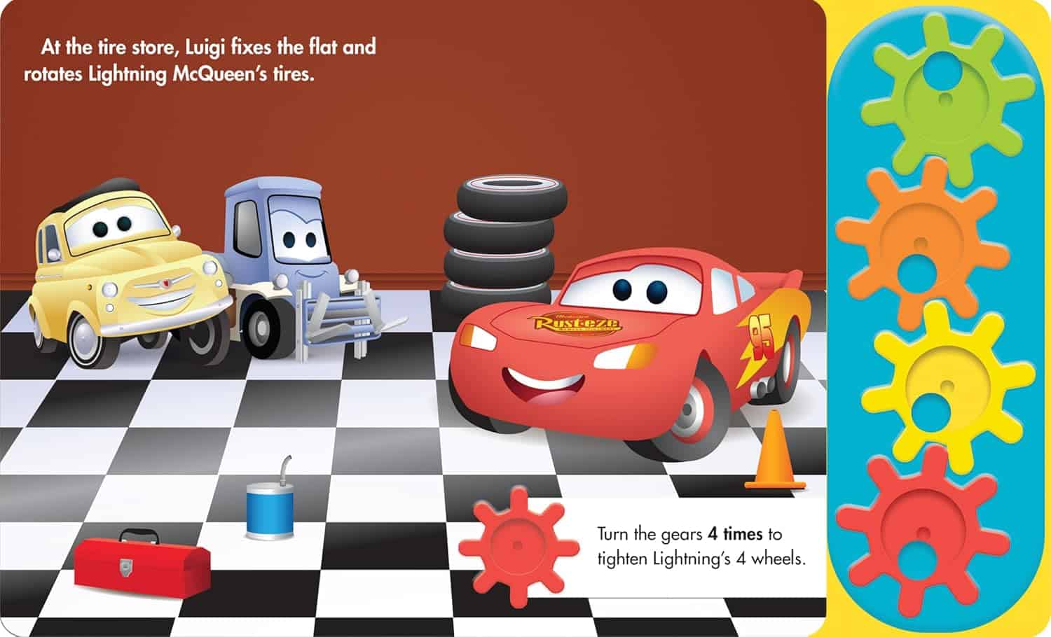 Spin the gears and go, go, go! Hear exciting vehicle sounds as you race along with Lightning McQueen and friends! Hands-on interactivity promotes STEM learning through play. Learning concepts include counting, cause-and-effect, and simple machines.