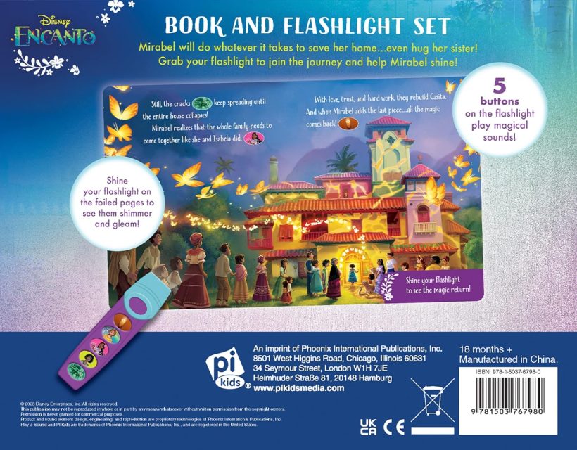 Mirabel will do whatever it takes to save her home… even hug her sister! With this Flashlight Adventure box set, children can come along on a magical journey with Mirabel and her family! Shine the flashlight on the foiled pages to make them shine and gleam. Press buttons on the flashlight to play 5 magical sounds! Includes a real working flashlight.