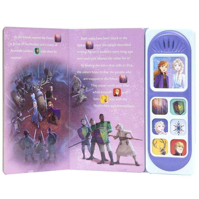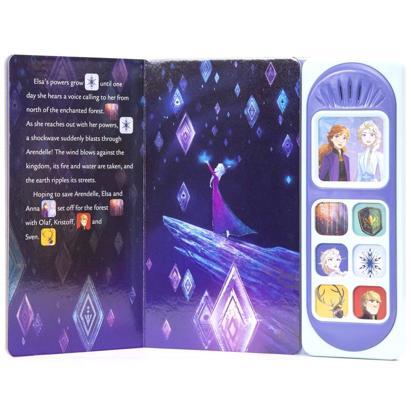 Press 7 interactive buttons to bring the snowy story to life with music and exciting sounds inspired by Disney’s Frozen 2. Matching words with pictures and sounds enhances reading comprehension, and connecting with favorite characters engages young readers at story time.