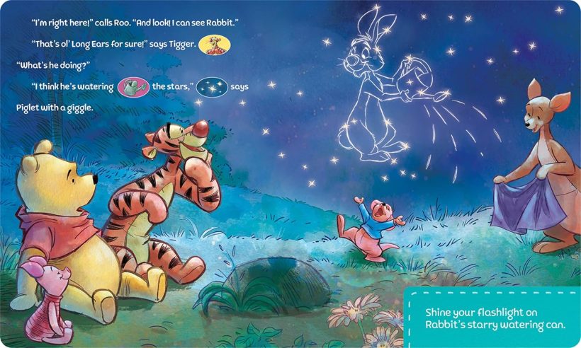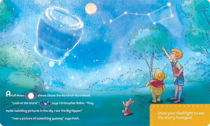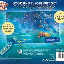 What does Winnie the Pooh see when he looks up at the night sky? Grab your flashlight to stargaze with Pooh and his friends! The foiled pages sparkle and shine in your flashlight’s glow, and 5 buttons on the flashlight play sounds to enhance the story! This sound storybook set encourages imagination, exploration, and learning through play. Includes a real working flashlight.