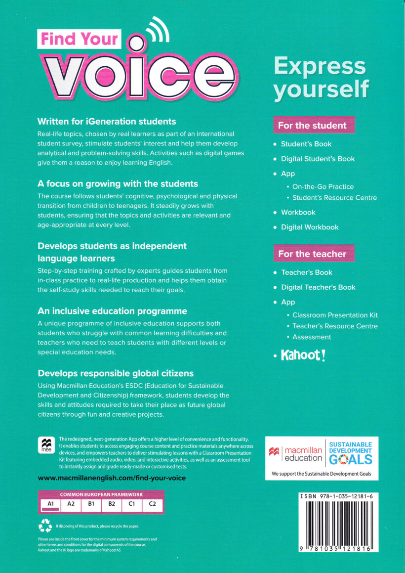 Find your voice je novi program izdavačke kuće Macmillan koji je prilagođen potrebama i interesovanjima tinejdžera. Udžbenik je pun svakodnevnih tema i situacija, pa tako nudi generaciji dece koja rastu u digitalnom dobu sadržaj iz stvarnog života i motiviše ih da uživaju u učenju engleskog jezika. Učenje je učinjeno još zabavnijim uz Kahoot igre koje su dostupne na https://shorturl.at/h8fHp .