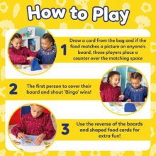 - HOW TO PLAY: Traditional bingo with a fun food themed twist! Draw a card from the bag, and place a knife and fork counter on any matching squares. The first player to fill their board wins. Then flip the boards over for some imaginative play, creating your favourite meal or the most unusual food combinations!