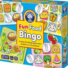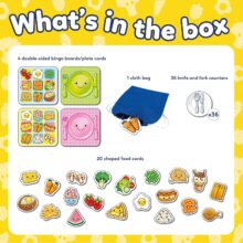 - WHAT’S IN THE BOX: Each of the Fun Food Bingo kids games includes 4 double-sided bingo boards/plate cards, 1 cloth bag, 36 knife and fork counters, 20 shaped food cards, and easy to follow instructions.