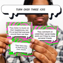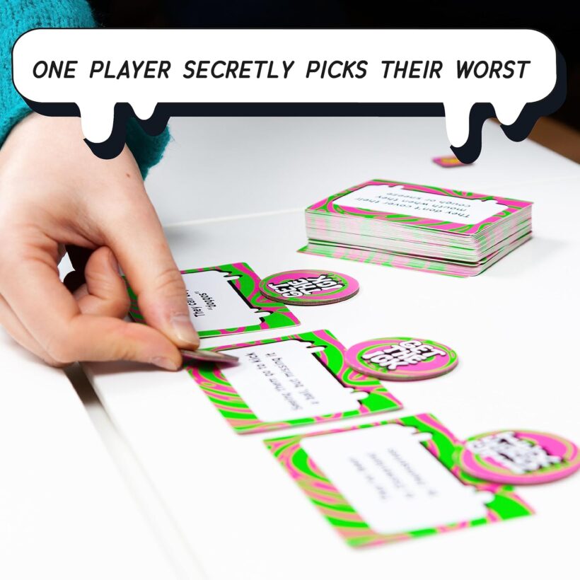 - 100 DIFFERENT ICKS INSIDE: Flip over three cards, secretly pick your least favourite one and hide the ‘Ick’ token underneath.