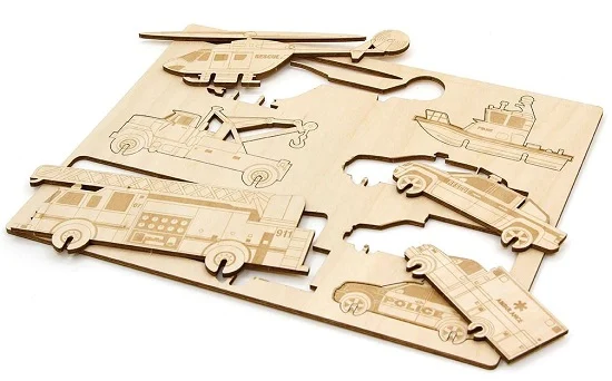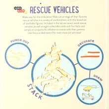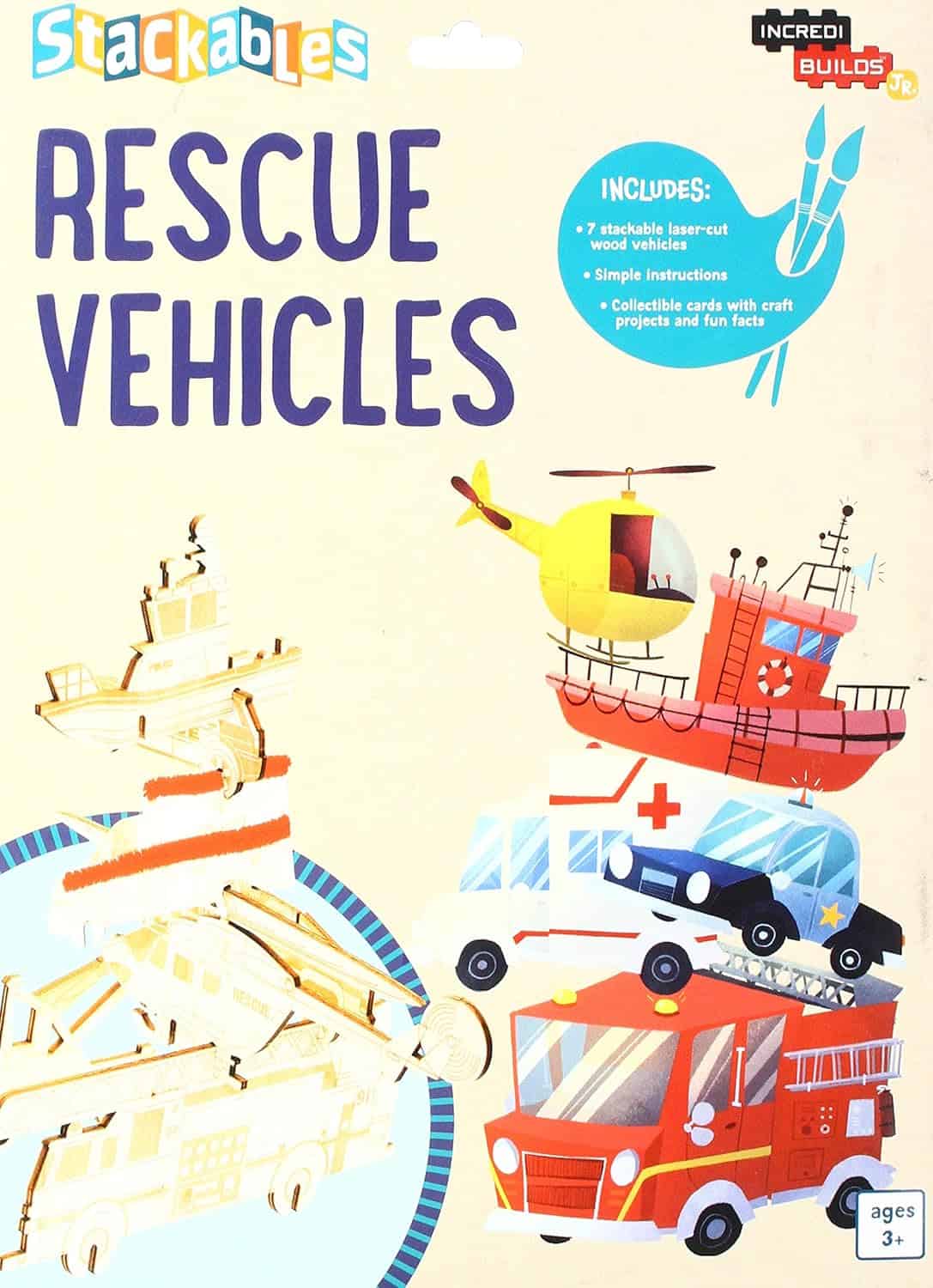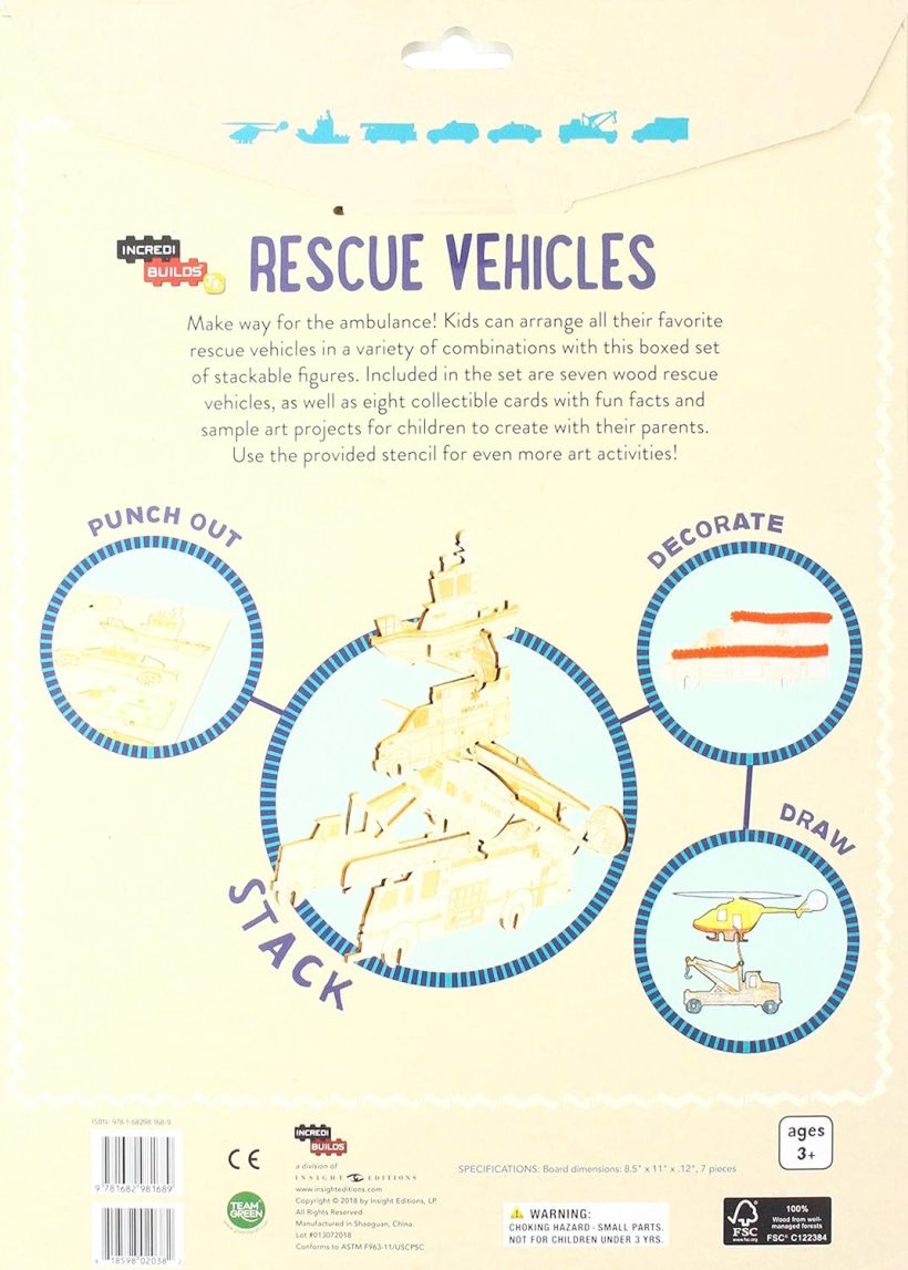Each box comes with a fire truck, an ambulance, a police car, a helicopter, and a tow truck, as well as nine fun fact and craft cards with sample art projects for parents to do with their kids to make each vehicle their own. Sturdy, all-natural wood is perfect for repeated stacking, making this a great activity for parents and young IncrediBuilders alike!