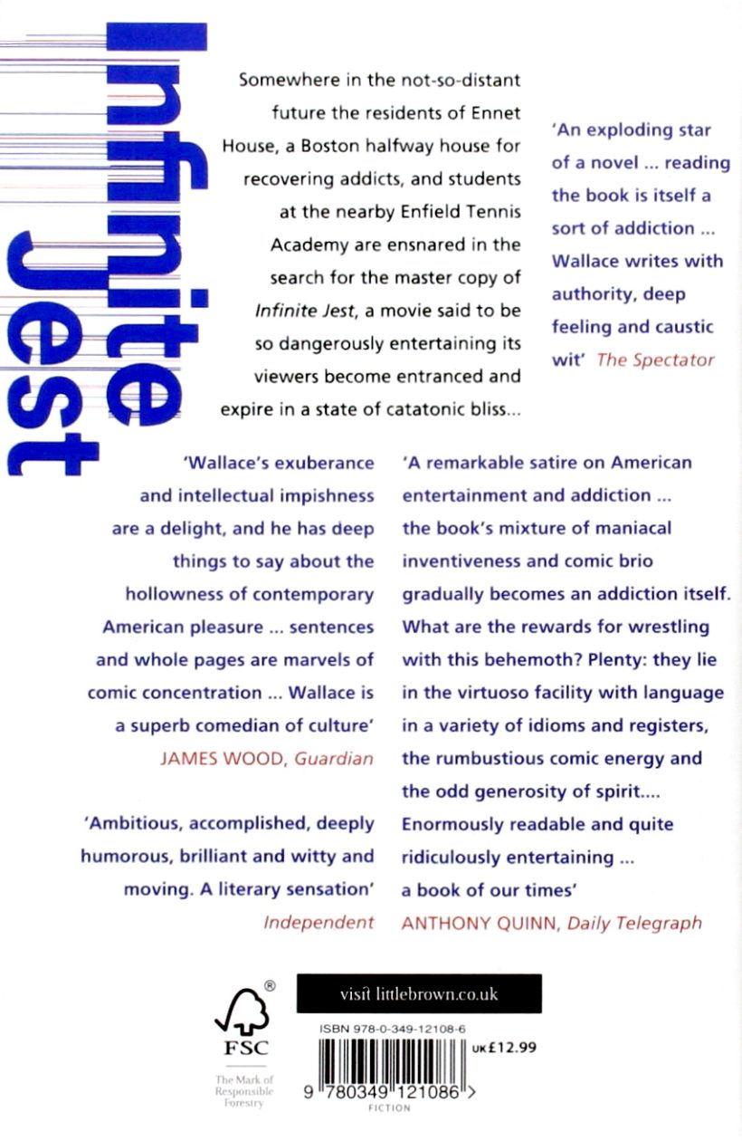 Somewhere in the not-so-distant future the residents of Ennet House, a Boston halfway house for recovering addicts, and students at the nearby Enfield Tennis Academy are ensnared in the search for the master copy of Infinite Jest, a movie said to be so dangerously entertaining its viewers become entranced and expire in a state of catatonic bliss . . .