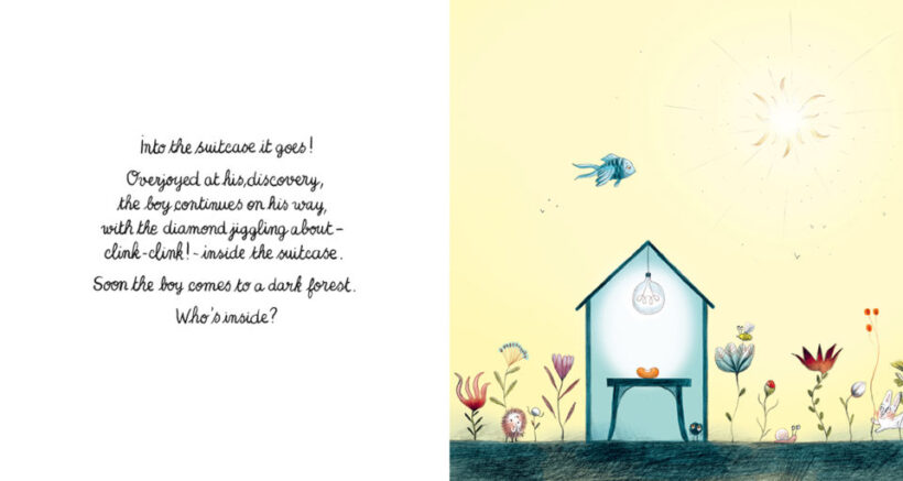 Away behind the hills you’ll find a charming little house. Who’s inside? Knock knock… A boy packing his suitcase. Lift the flaps to see what he takes, and travel with him over oceans and mountains, underwater and into the forest. With every step on this voyage of obstacles the boy faces a decision that will lead to a new adventure and help him get home. Delve deeper into each page and remember to use what’s in the suitcase!