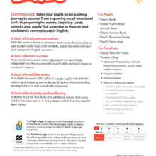 Learning Lands je moderan program za učenje engleskog jezika koji se sastoji od 6 nivoa. Udžbenik je dizajniran tako da pomogne učenicima da samouvereno komuniciraju na engleskom jeziku u različitim kontekstima, a u isto vreme podržava i njihov lični razvoj.