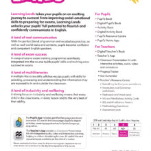 Learning Lands je moderan program za učenje engleskog jezika koji se sastoji od 6 nivoa. Udžbenik je dizajniran tako da pomogne učenicima da samouvereno komuniciraju na engleskom jeziku u različitim kontekstima, a u isto vreme podržava i njihov lični razvoj.