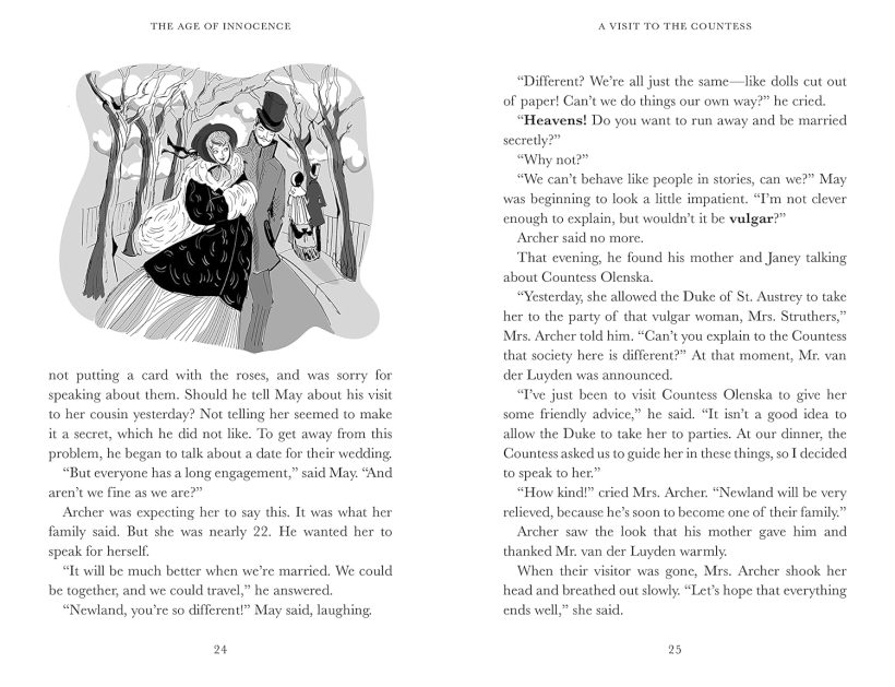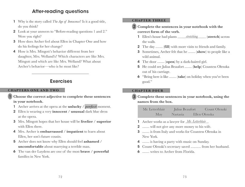 The Age of Innocence, a Level 4 Reader, is A2+ in the CEFR framework. The text is made up of sentences with up to three clauses, introducing more complex uses of present perfect simple, passives, phrasal verbs and simple relative clauses. It is well supported by illustrations, which appear regularly.
