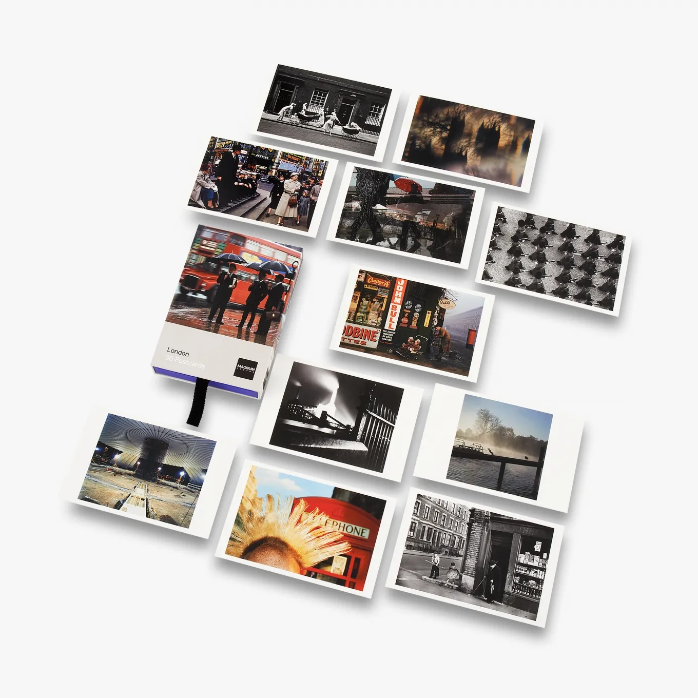 Thirty- six unique postcards, each featuring an iconic London street scene from a Magnum photographer