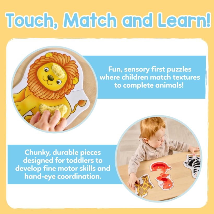 - MATCH AND FEEL JIGSAWS: Designed to engage young minds each piece is crafted with a unique texture to feel and match, encouraging sensory exploration and enhancing fine motor skills in a playful and educational way.