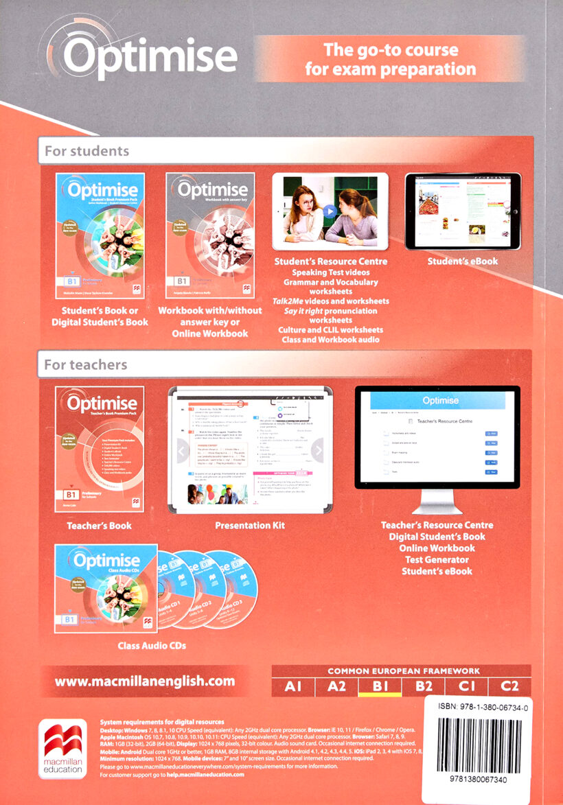 The Workbook (With Answer Key) provides further opportunities to revisit and consolidate the vocabulary, structures and skills students have already encountered in each unit. At the end of every Workbook unit, there is a Progress check. At the end of the Workbook, there is a full Optimise Practice test based on the Cambridge for Schools exam.