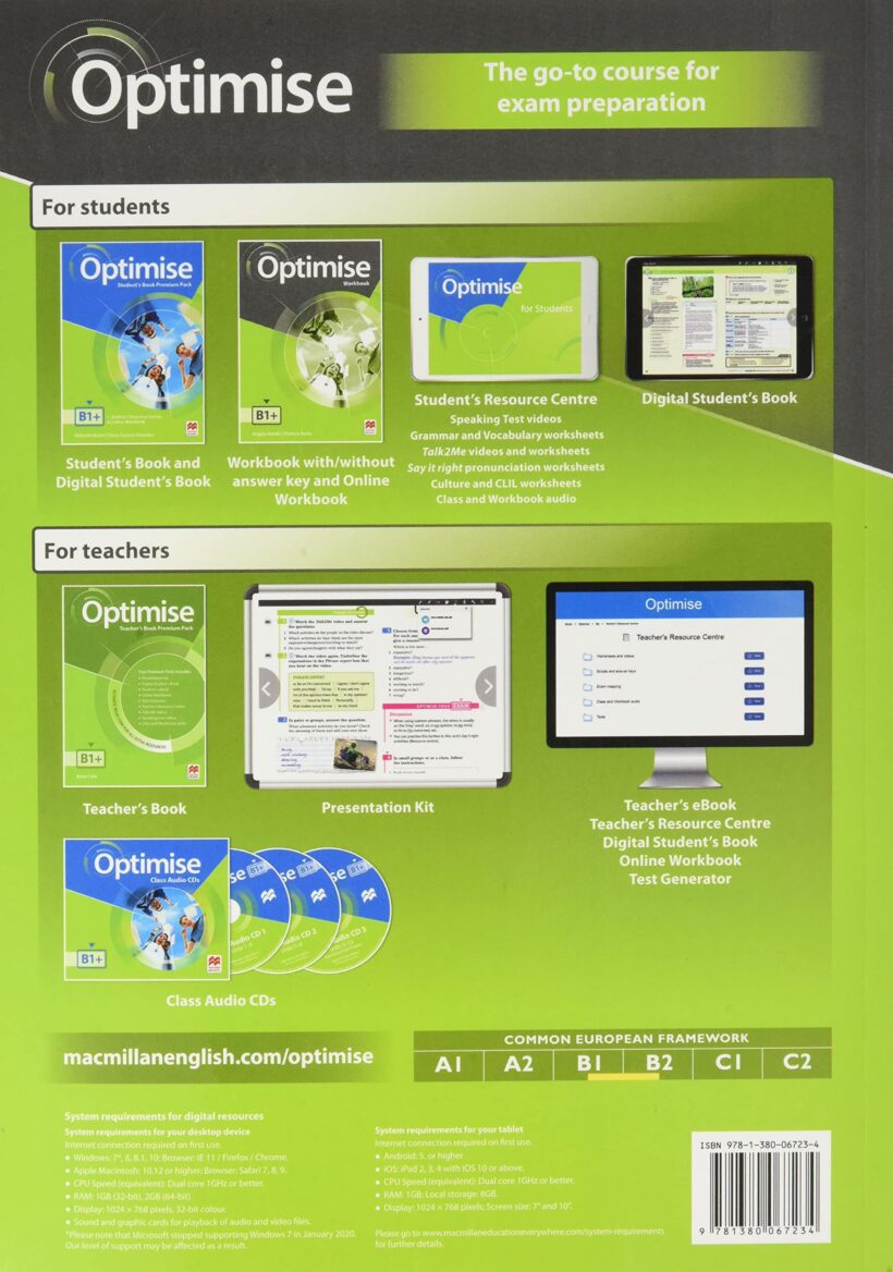 The Workbook (Without Answer Key) provides further opportunities to revisit and consolidate the vocabulary, structures and skills students have already encountered in each unit. At the end of every Workbook unit, there is a Progress check. At the end of the Workbook, there is a full Optimise Practice test based on the Cambridge for Schools exam.
