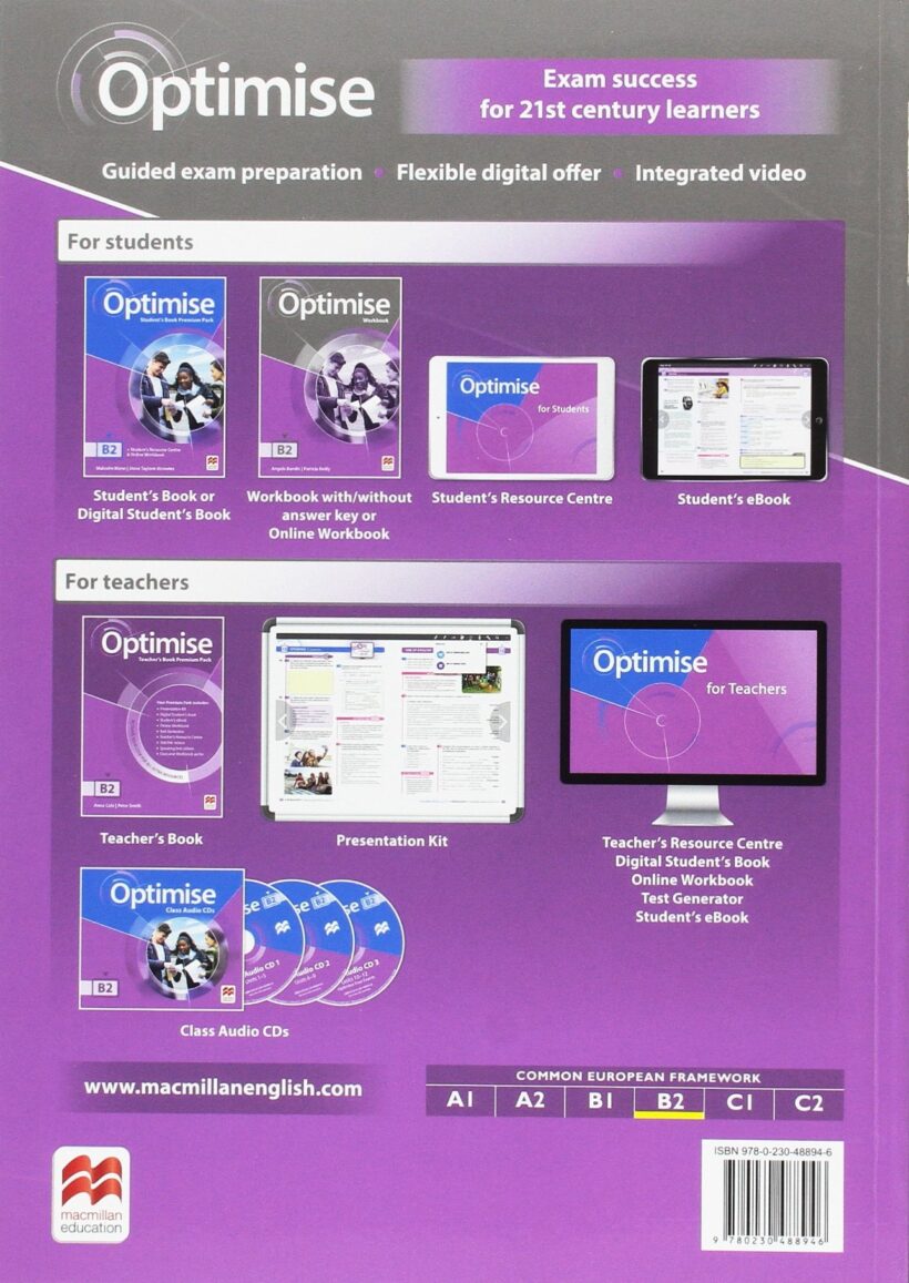 The Workbook (Without Answer Key) provides further opportunities to revisit and consolidate the vocabulary, structures and skills students have already encountered in each unit. At the end of every Workbook unit, there is a Progress check. At the end of the Workbook, there is a full Optimise Practice test based on the Cambridge for Schools exam.