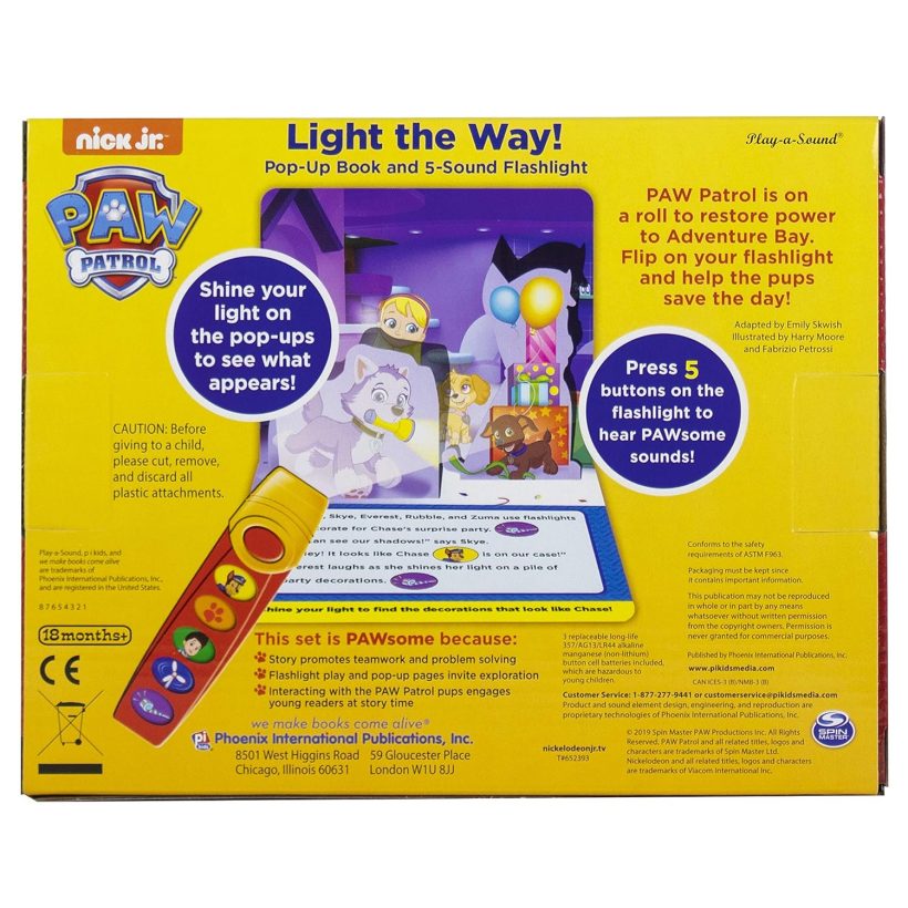 Join Chase, Marshall, Skye and more of the PAW Patrol pups on an exciting journey to restore power to Adventure Bay! Shine a beam from the included flashlight to reveal the hidden secrets of the pop-ups on every spread, and press the flashlight’s buttons to hear sounds and music that enliven the story. Help the courageous and adorable PAW Patrol save the day!