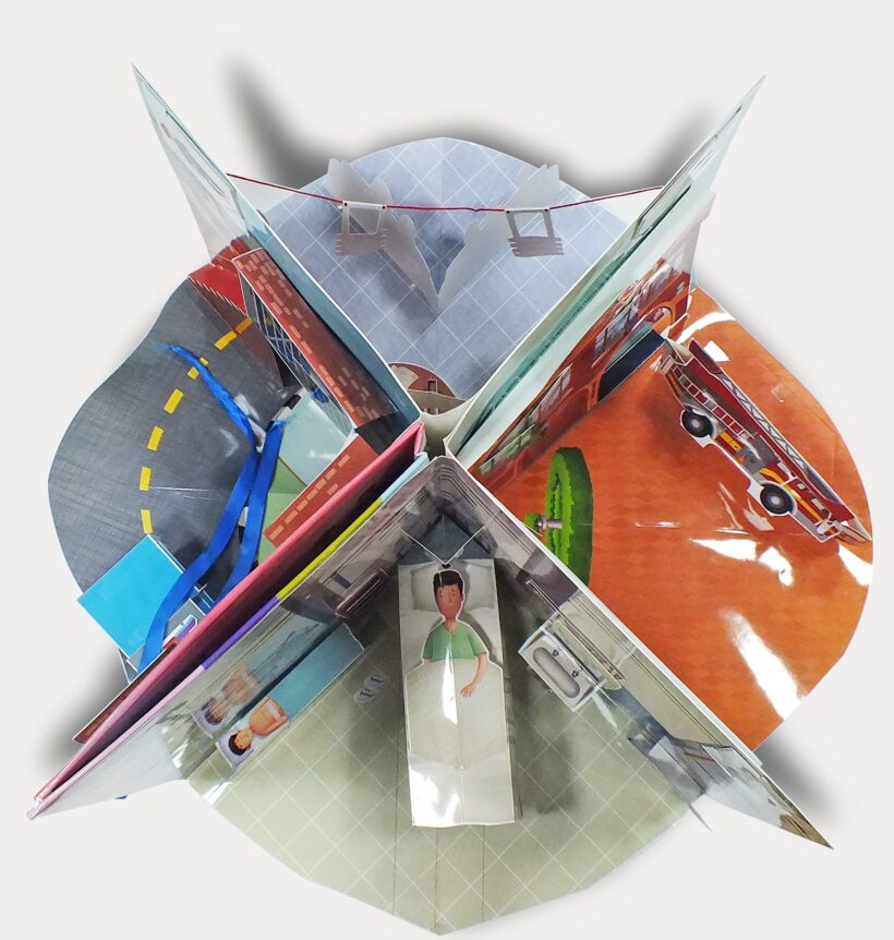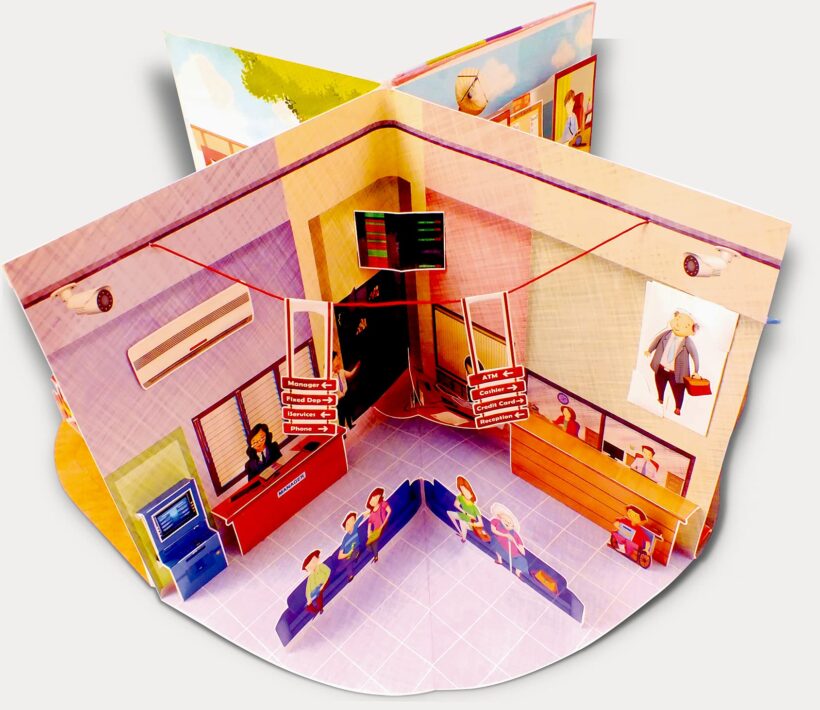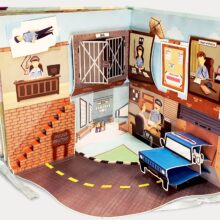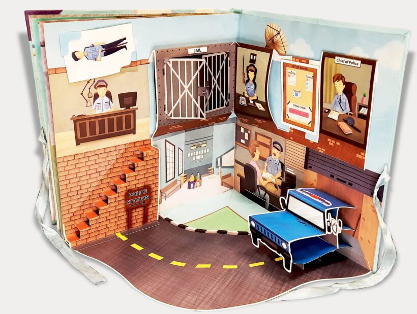 The book displays Police Station, Fire Station, Hospital with pull-outs showing a doctor, a police officer, a fireman and many more.