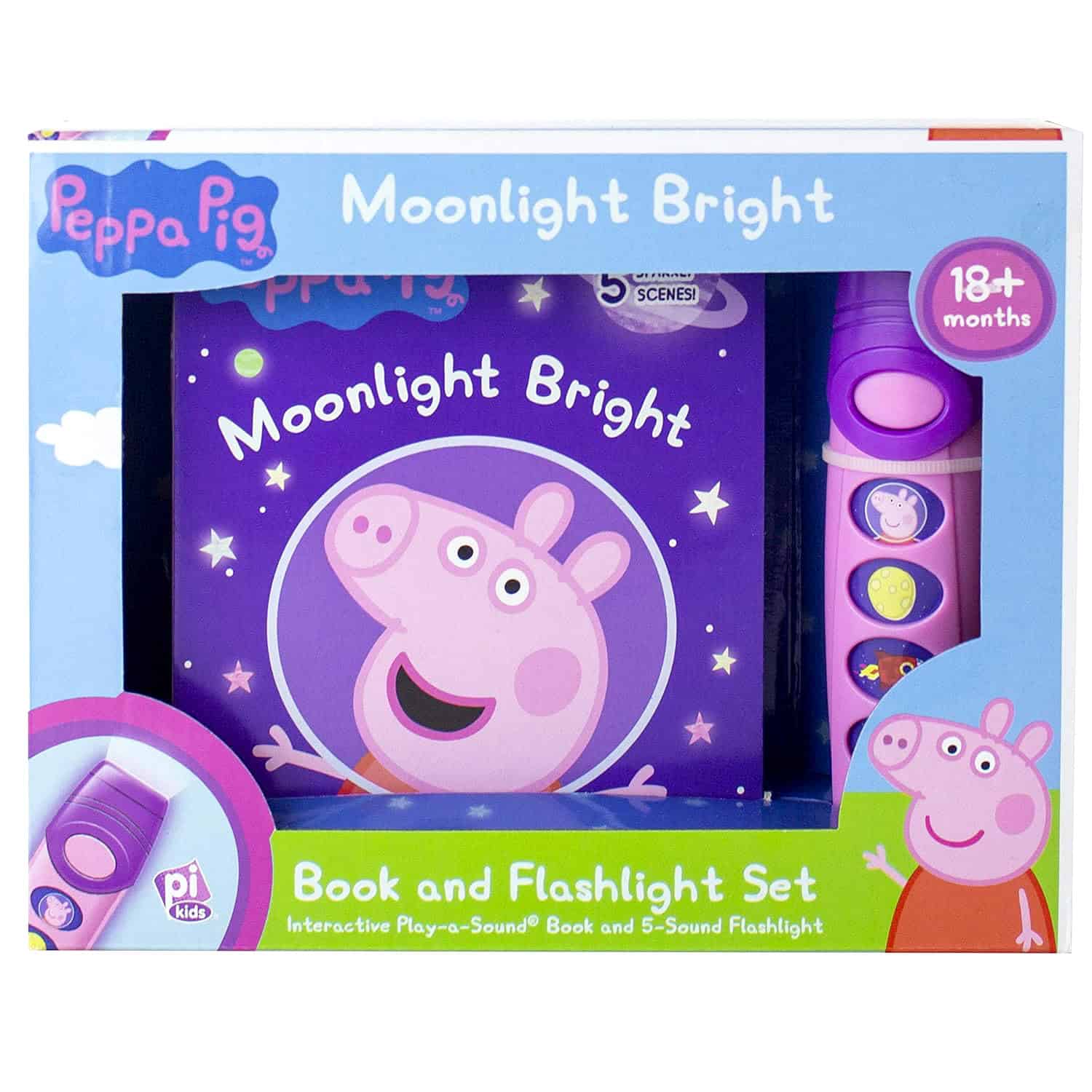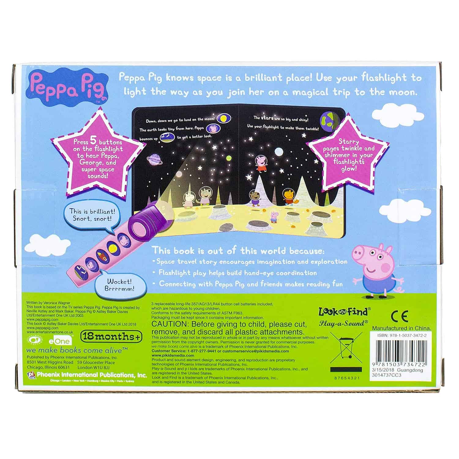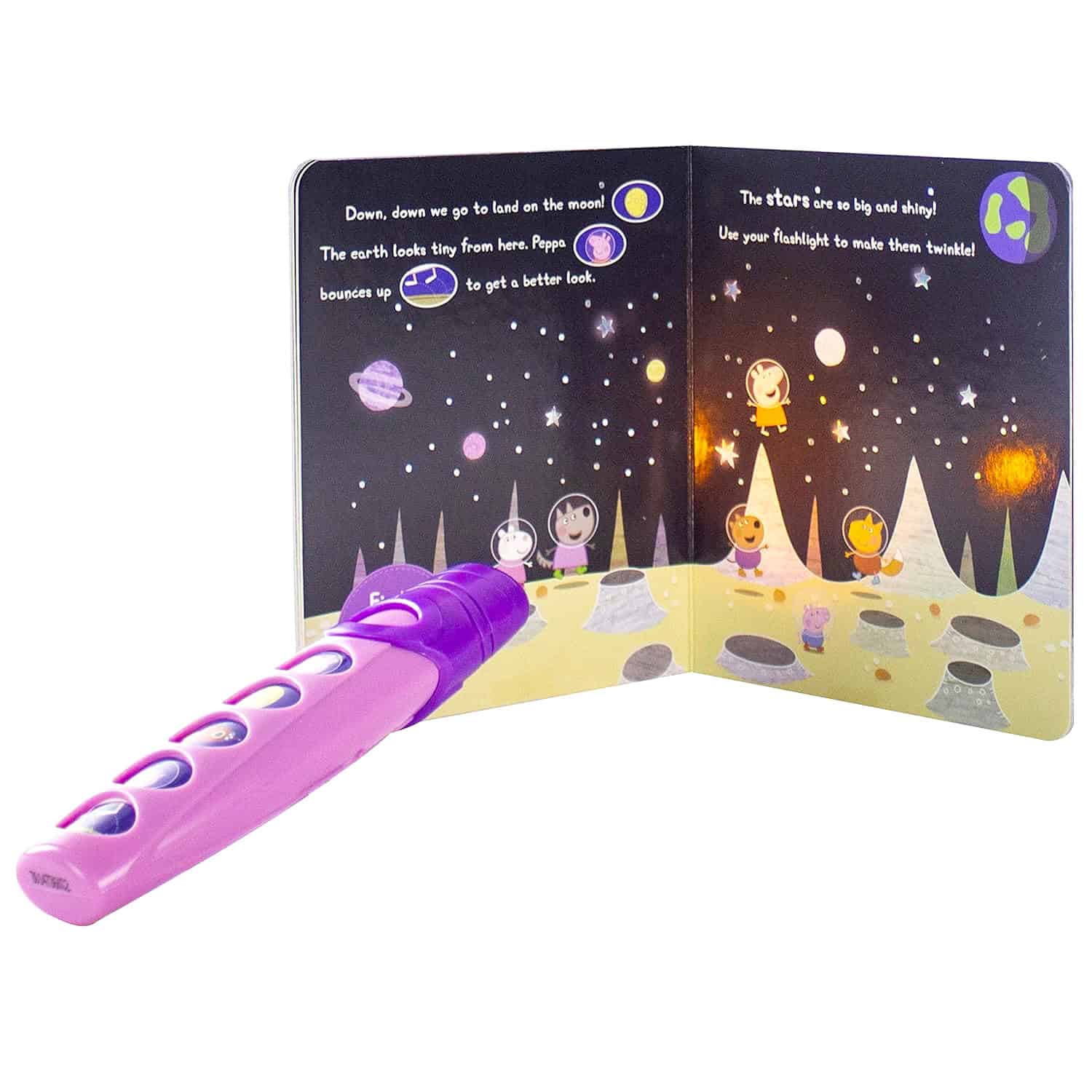 Peppa Pig knows space is a brilliant place! Use your flashlight to light the way as you join her on a magical trip to the moon. Along the way, stop to explore 5 exciting Look and Find scenes! The starry, foiled pages twinkle and shimmer in your flashlight’s glow, and 5 buttons on the flashlight play Peppa Pig voices and sounds. This exciting space travel story encourages imagination, exploration, and learning through play.