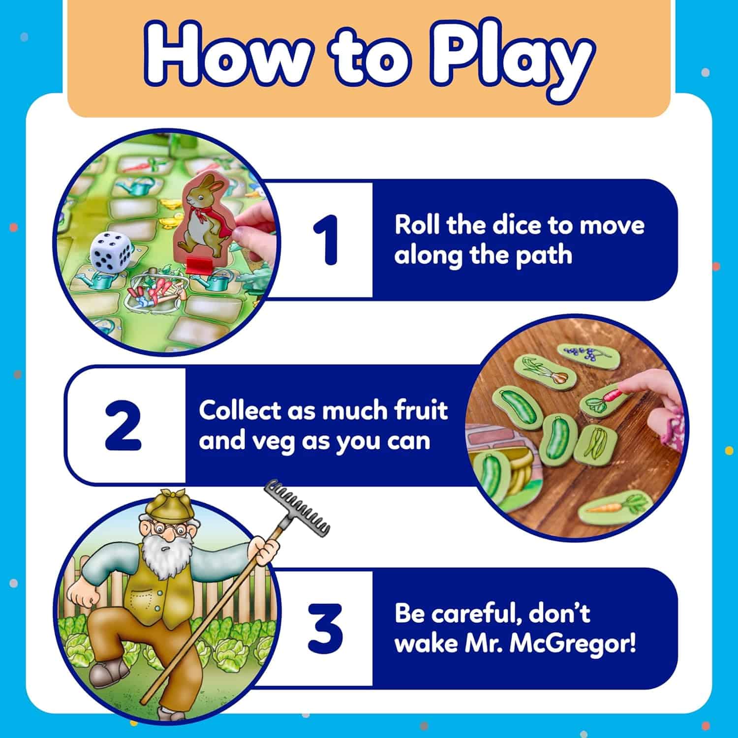 - HOW TO PLAY: Join Peter Rabbit and his friends Benjamin Bunny, Flopsy and Mopsy as they race to collect fruit and vegetables in this exciting toddler board game, but watch out for Mr. McGregor – if you wake him up, you’re out of luck!