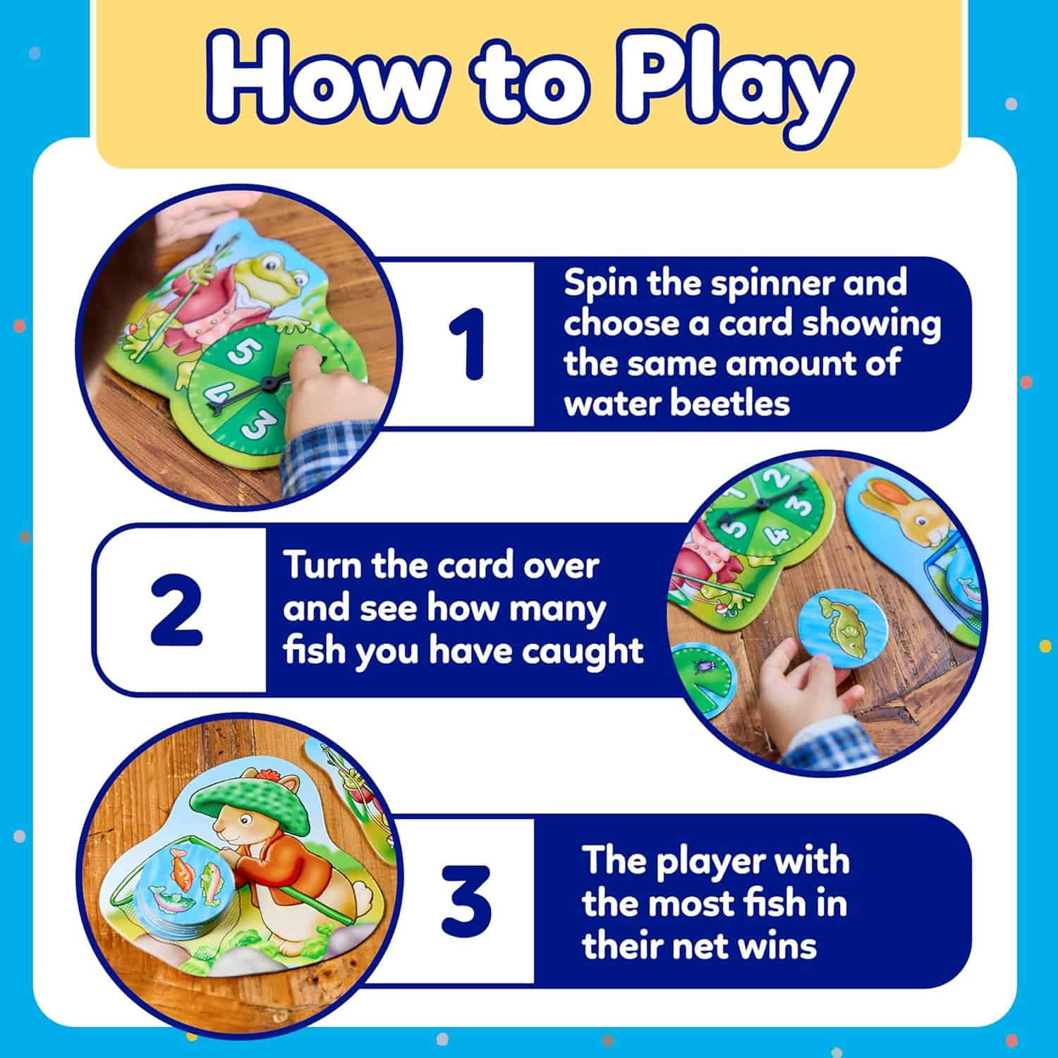 - CONTENTS: Each Fish and Count maths game contains 30 fish/beetle cards, 4 character boards, 1 spinner board, 1 2-part spinner, and 1 instruction booklet.