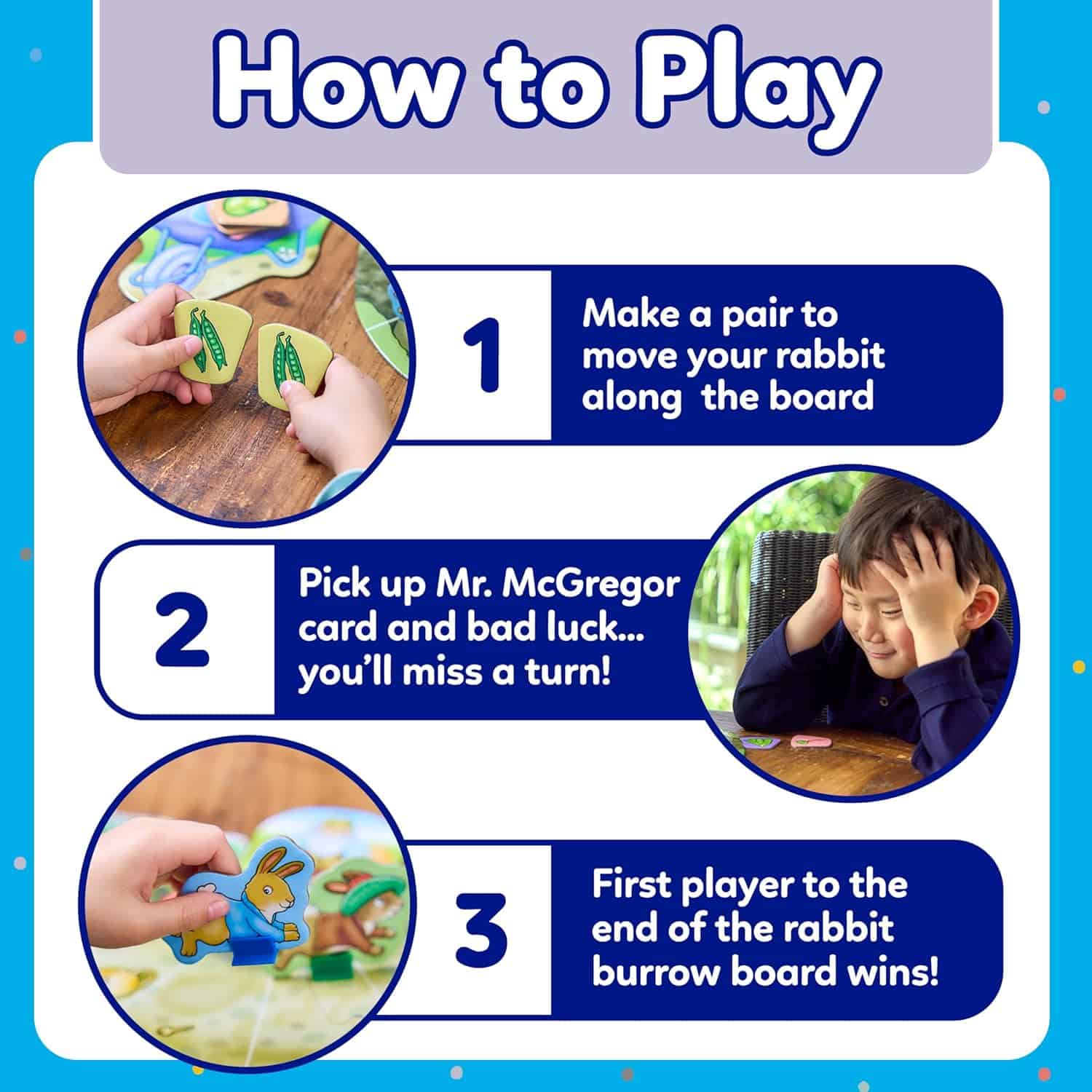 - HOW TO PLAY: Race to reach Mr. McGregor’s fruit and vegetable trug in this exciting Peter Rabbit matching game. Match pairs of cards and move your rabbit along the burrow to be the first to win! Don’t forget to watch out for the flowerpot with Mr. McGregor on the other side, as you will miss a turn!