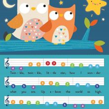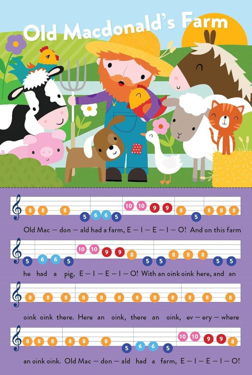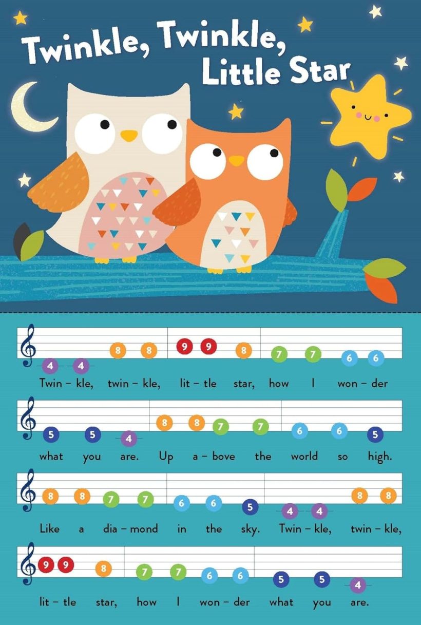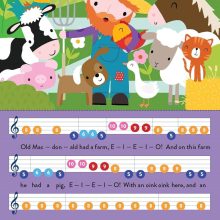 An inbuilt electronic piano and pages with coloured notes and simple tunes make music playing accessible to the littlest learners! Play and sing 6 easy nursery rhymes on your own electronic keyboard, including Twinkle Twinkle Little Star, Old MacDonald, The Wheels on the Bus and more.