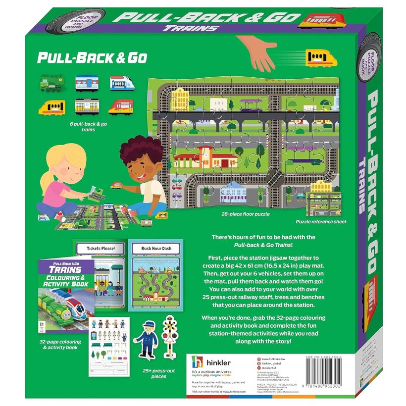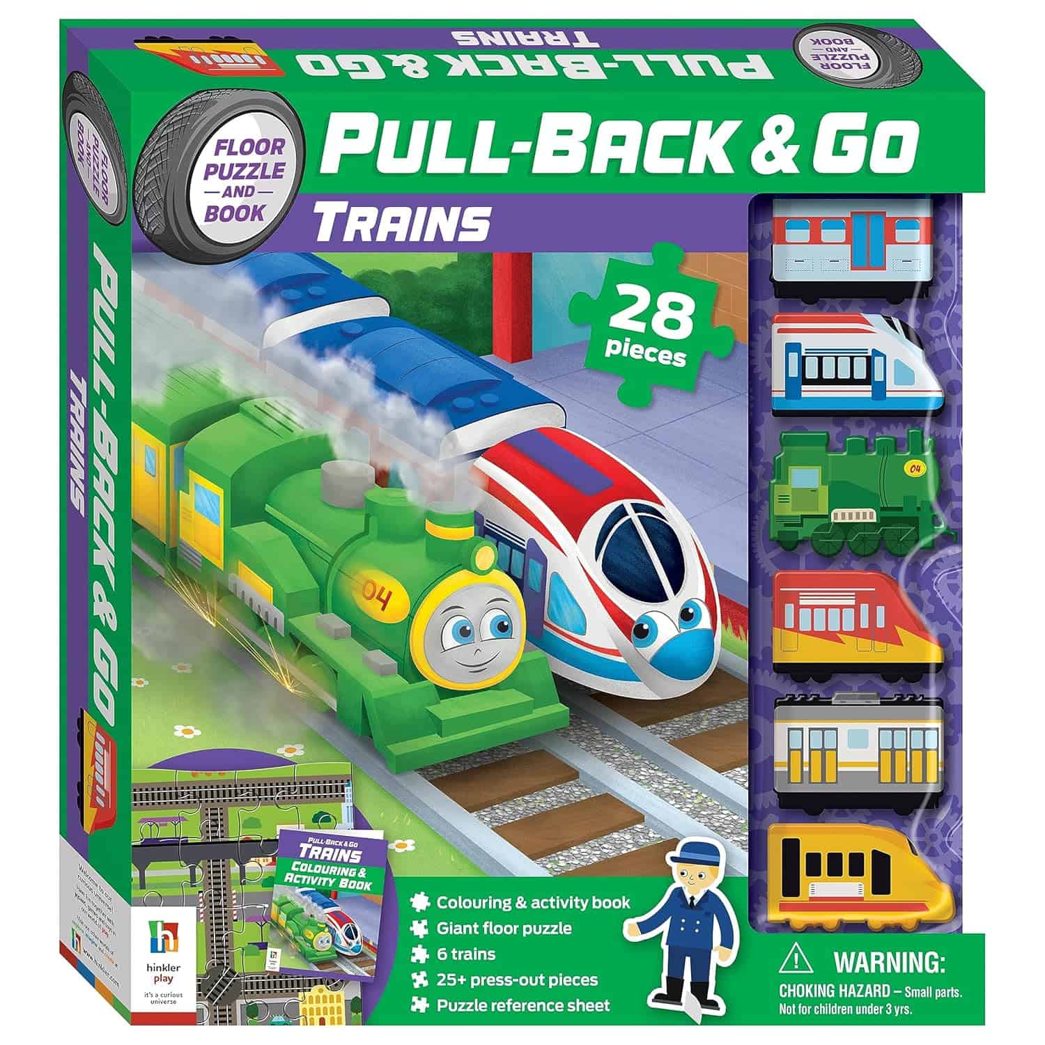 There’s hours of fun to be had with the Pull-back-and-go Trains activity set! First, piece the railway jigsaw together to create a big 42 x 61 cm (16.5 x 24 in) play mat. Then, get out the 6 vehicles, set them up on the mat, pull them back and watch them go!