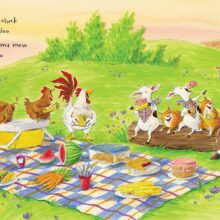 In a rhythmic read-aloud picture book, brimming with the irresistile sounds that farmyard animals make, Anne Vittur Kenny wonders, What mischief do the horses and cows and sheep get up to when the farmer’s back is turned? Well, there’s boating (of course!), as well as a picnic, a rollercoaster ride, a hot-air balloon, ballroom dancing and … oh no! Could that arf! arf! arf! mean the farmer’s heading back? Even the youngest of listeners can read this book aloud by following along with the pictures and making each animal’s trademark sound.