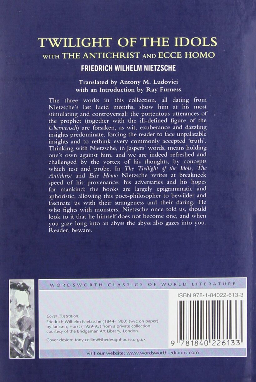 In The Twilight of the Idols, The Antichrist, and Ecce Homo Nietzsche writes at breakneck speed of his provenance, his adversaries and his hopes for mankind; the books are largely epigrammatic and aphoristic, allowing this poet-philosopher to bewilder and fascinate us with their strangeness and their daring. He who fights with monsters, Nietzsche once told us, should look to it that he himself does not become one, and when you gaze long into an abyss, the abyss also gazes into you. Reader, beware.